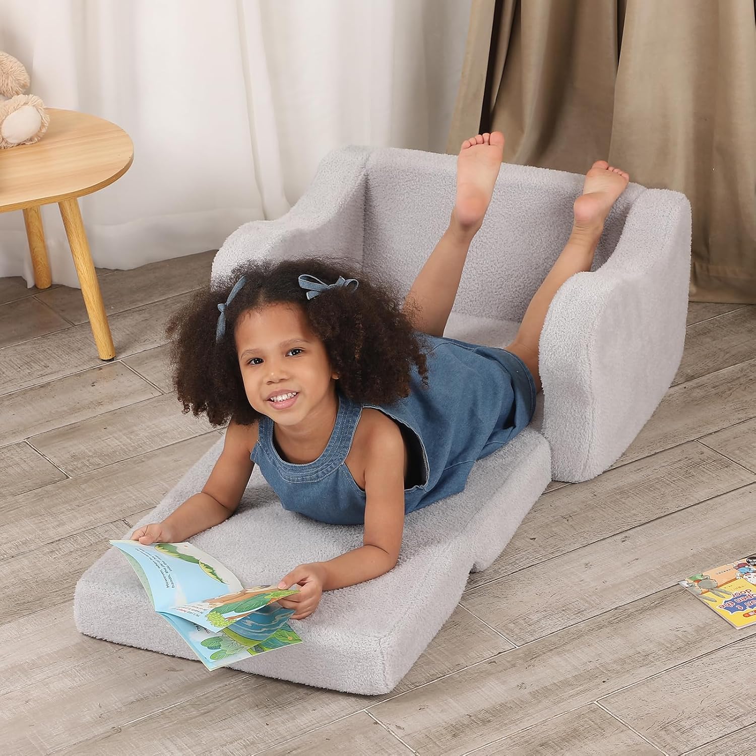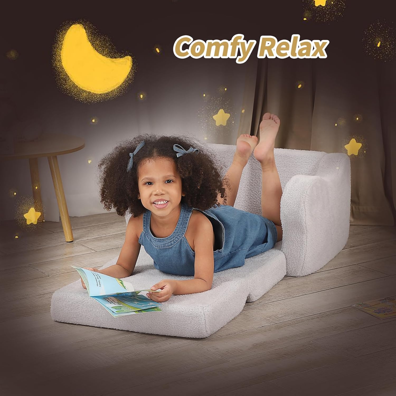 - A Fluffy Star Throw Pillow: The toddler couch with a soft star throw pillow effect for kids sitting and reading or watching their favourite cartoon. During nap time this sofa chair folds out into a comfy nap pad