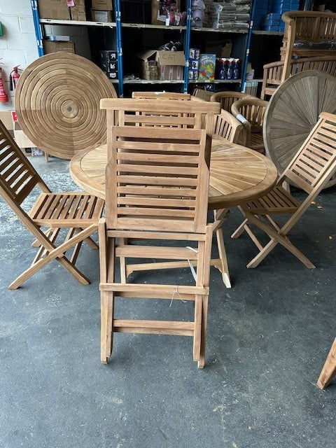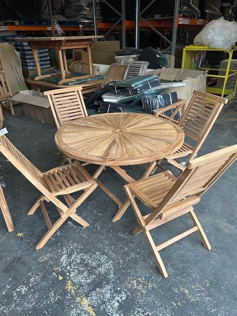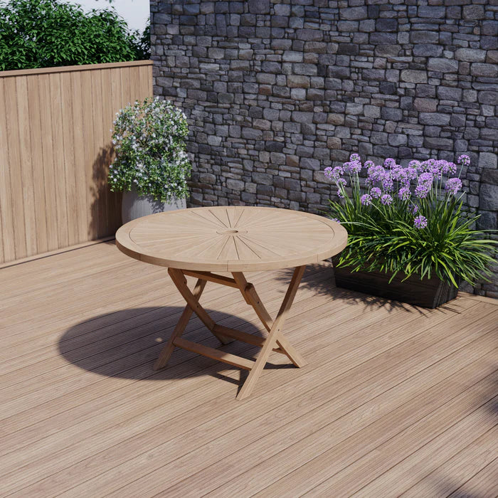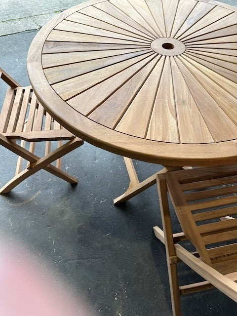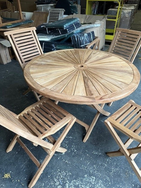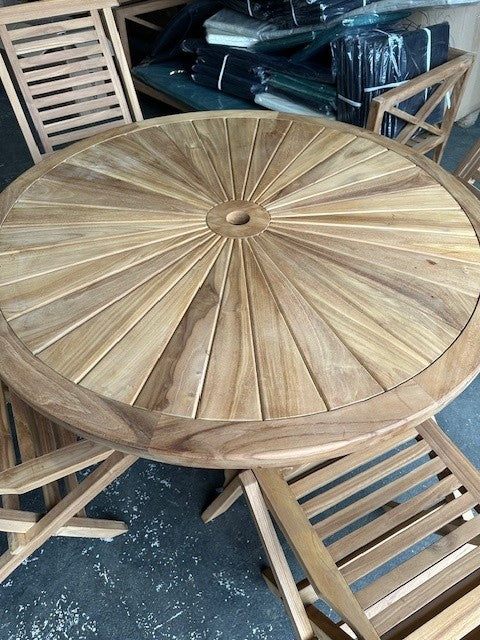 Exquisite 120cm Teak Round Sunshine table, an ingenious combination of elegance and functionality. This luxurious piece of furniture features a meticulously crafted teak table top that is both sturdy and sleek, infusing a charming ambiance into your outdoor space.