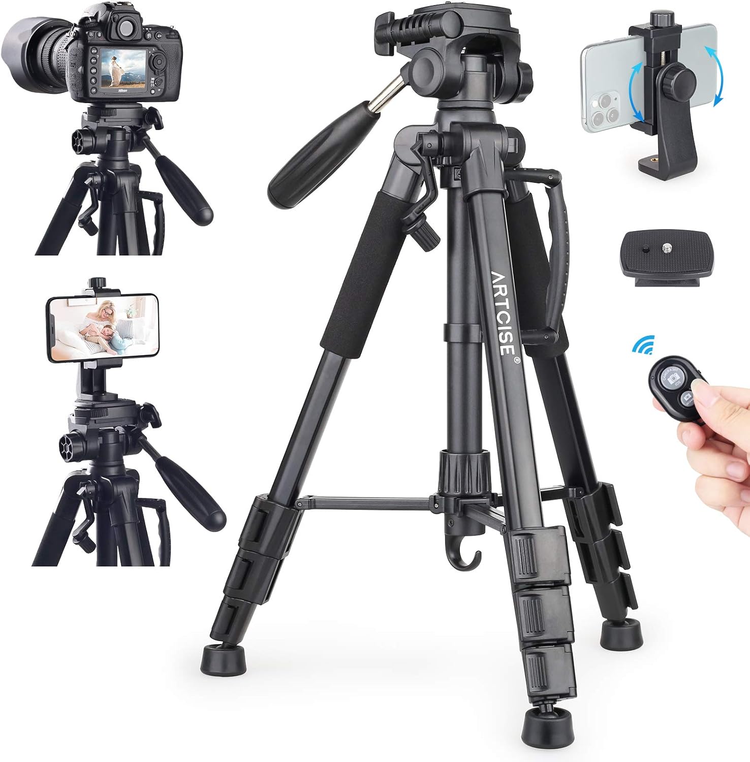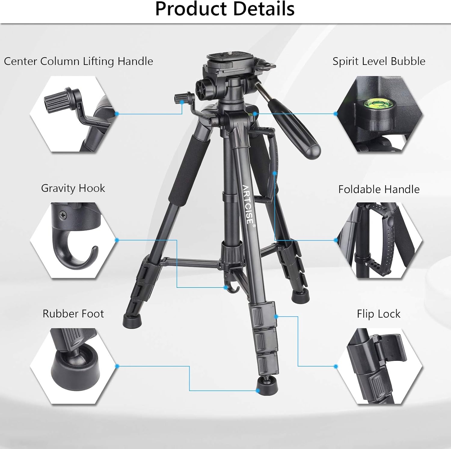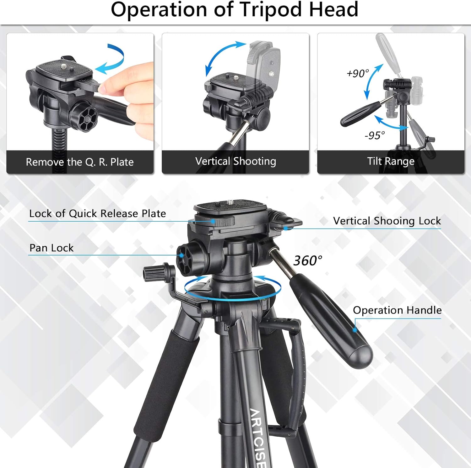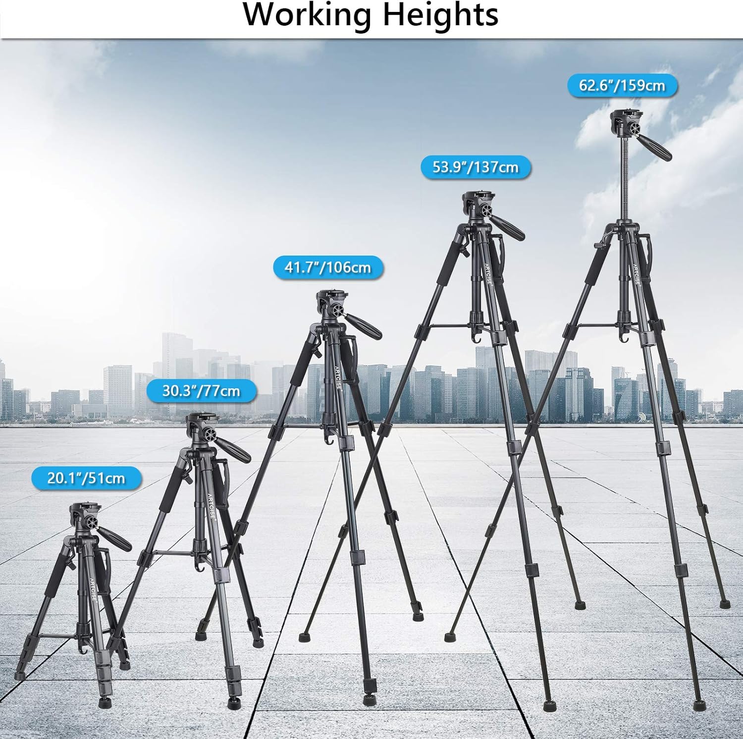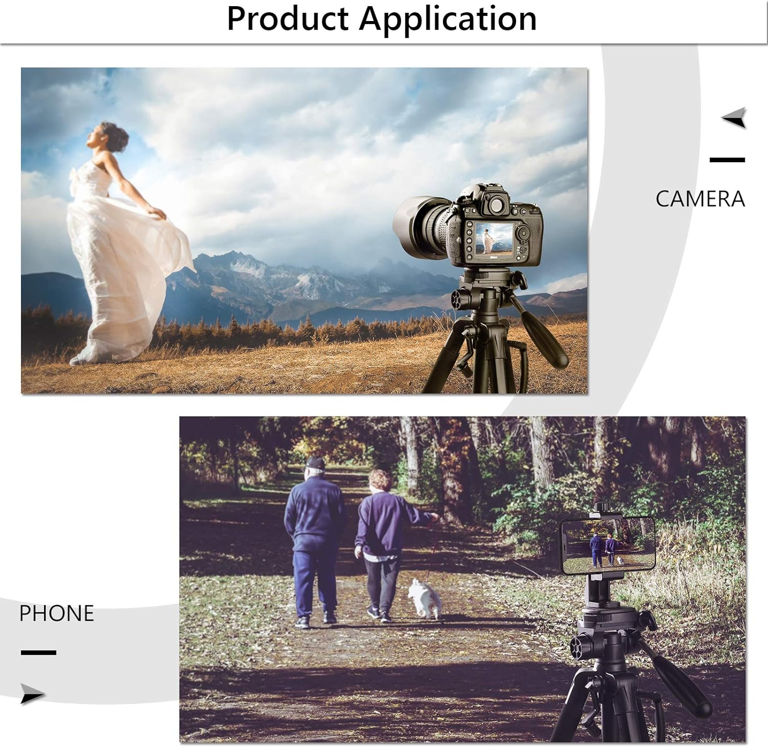 - 【Easy Adjustment】360-degree swivel function pan head of this camera tripod can be adjusted and screwed easily , upper and lower, left and right, and flexible control of vertical flip.4-section legs and centre column, satisfying your wanted height (from 51cm/20.1’’ to 159cm/62.6’’).